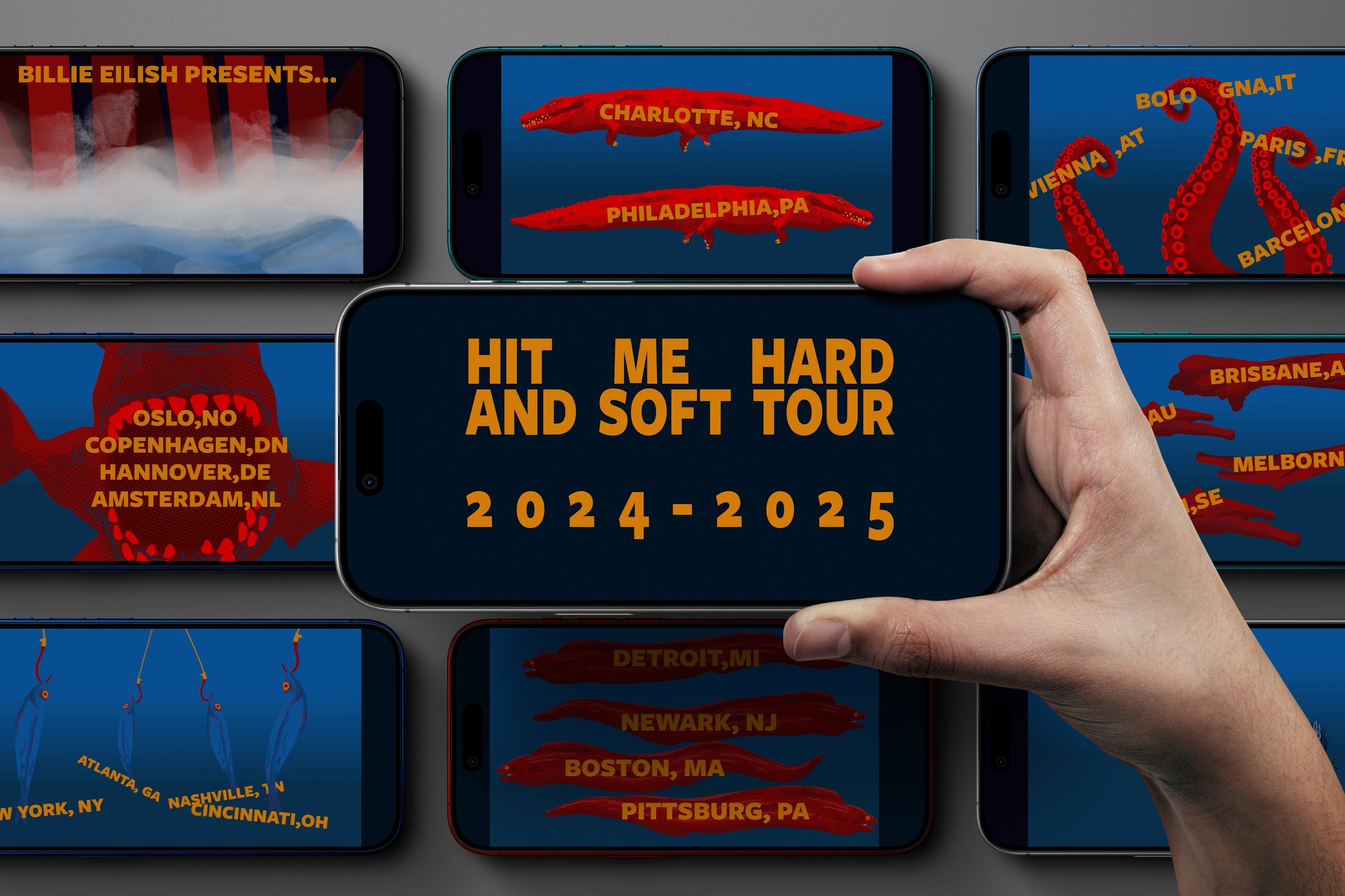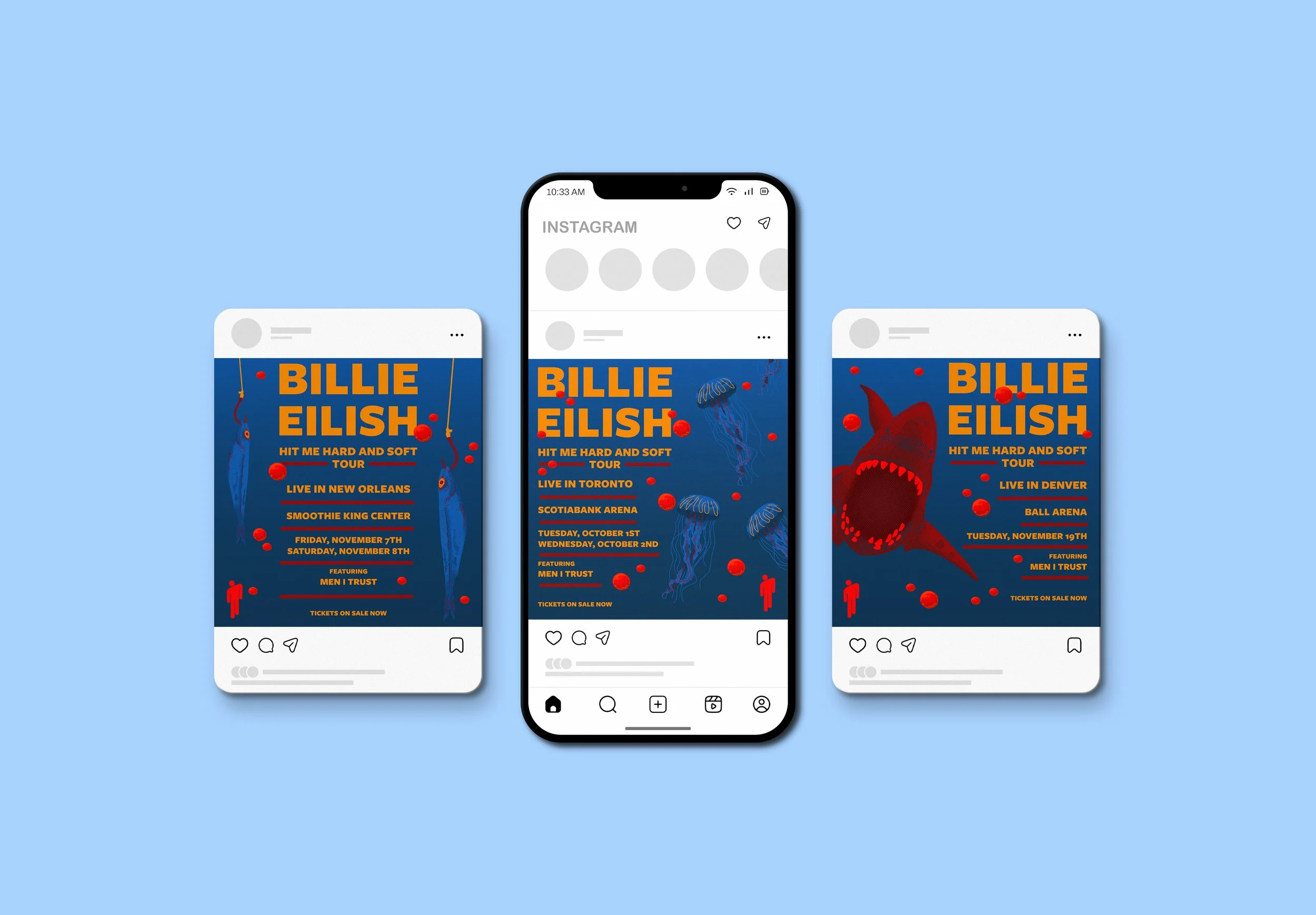 The Hit Me Hard and Soft Tour Announcement Campaign is a promotional design series built to announce and promote tour dates through a unified visual system. Inspired by the visual language of Billie Eilish’s Hit Me Hard and Soft album cover, the campaign focuses on bold color and striking composition to capture attention across social media and digital platforms.