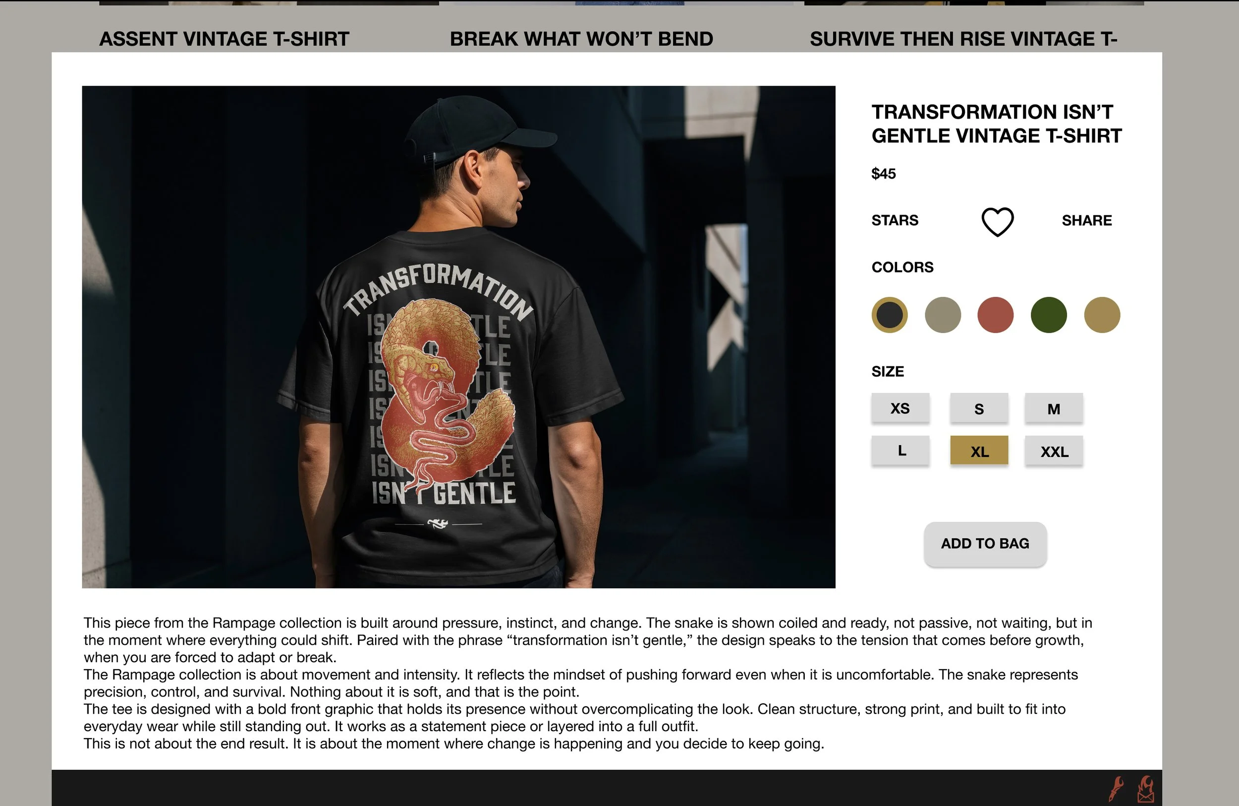The website and app extend this system, using the same color palette, typography, and graphic language to create a consistent experience across every platform. Layout, spacing, and hierarchy are kept simple and intentional, allowing the visuals to lead while keeping the interface easy to navigate. Phoenix is built as a complete brand, not just clothing, where every part connects back to a unified design approach.